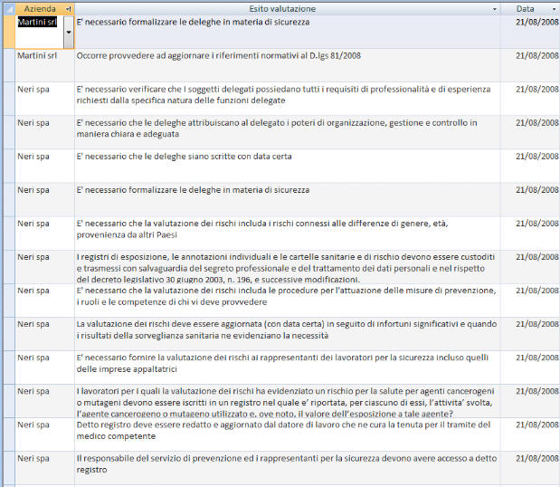 (azienda, misure di miglioramento da applicare, data valutazione) per